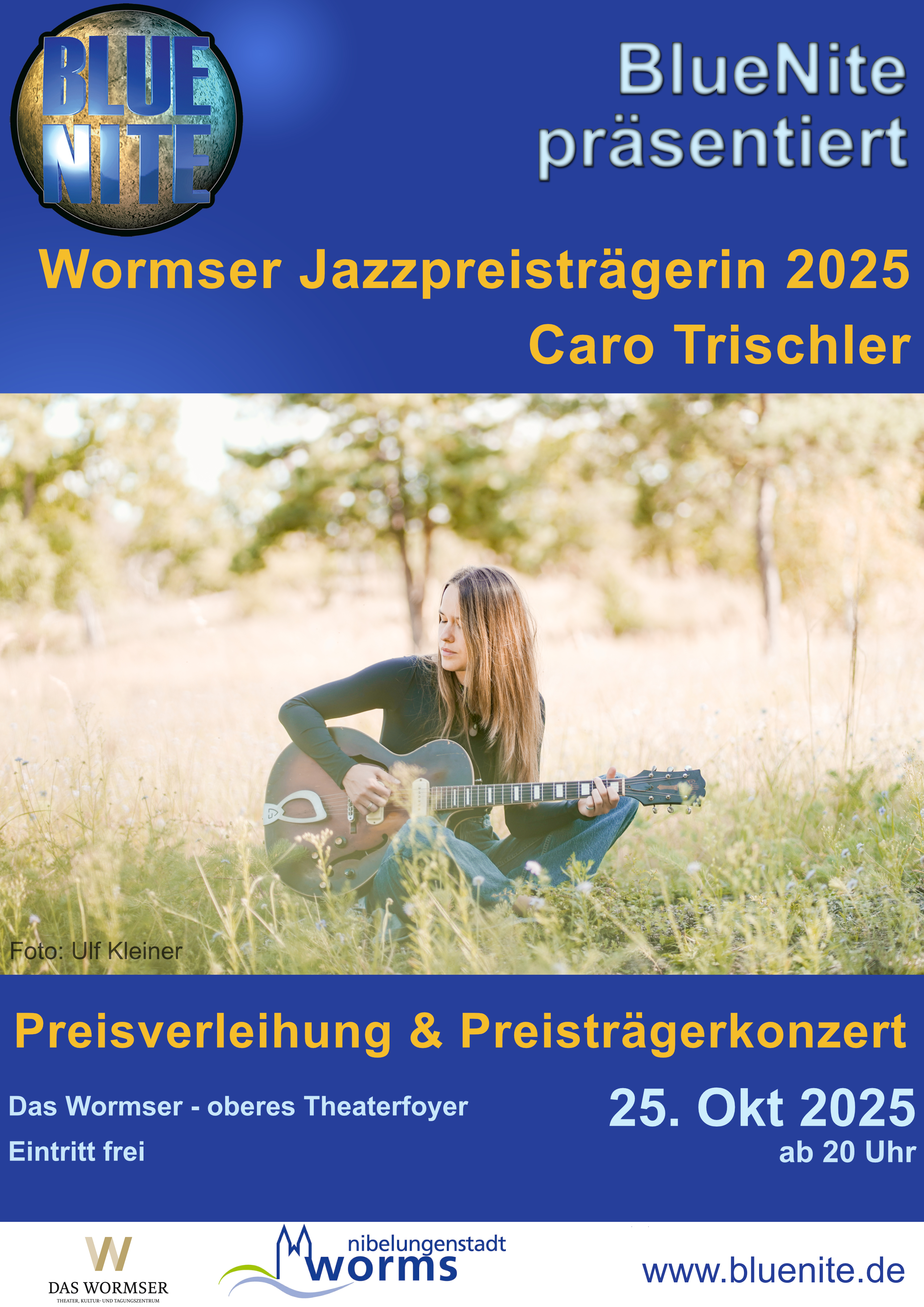 Die Verleihung des Jazzpreises durch einen Vertreter der Stadt Worms und Volker Wengert als Jurymitglied und Vorsitzendem der Jazzinitiative BlueNite erfolgt traditionell im Rahmen des Preisträgerkonzertes, das in diesem Jahr am Samstag, 25. Oktober, 20 Uhr, bei freiem Eintritt im oberen Foyer des Wormser Theaters stattfindet. Die Stadt Worms übernimmt die Kosten für die Veranstaltung und das Konzert. Zudem spricht sie eine Einladung an Caro Trischler aus, beim Festival „Worms: Jazz & Joy“ im kommenden Jahr aufzutreten.